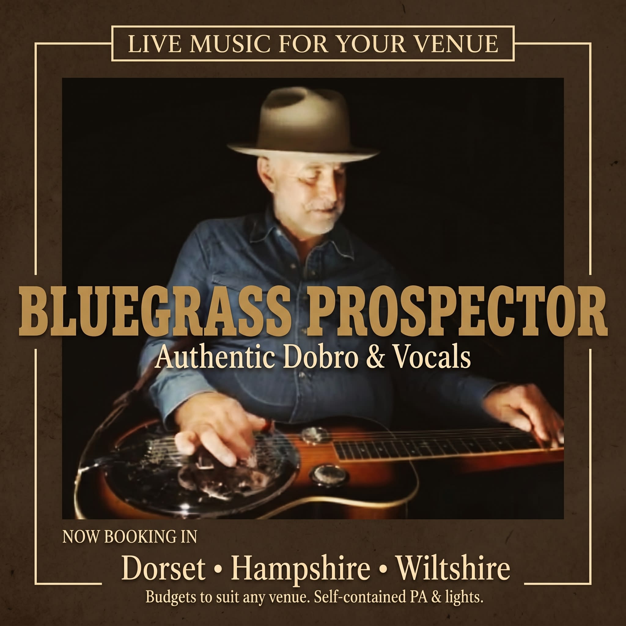 Authentic dobro resonator guitar player 20 years experience and vocals, played to custom made backing tracks of bluegrass standards and some country classics