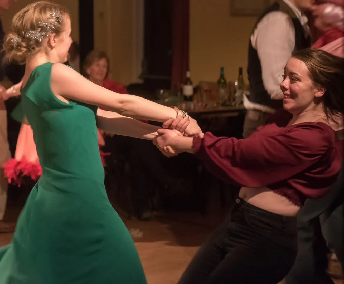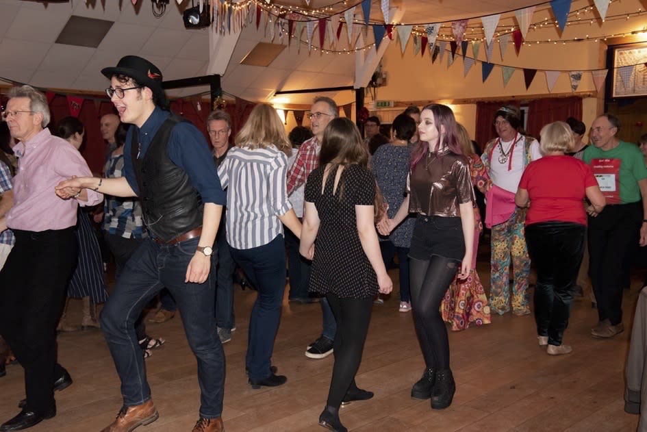 The sort of music we play is basically traditional dance tunes from wherever we can get them, and our standard line-up is melodeon, fiddle, flute and guitar. There’s no set format, or length of time that we play for, and we’ll be as flexible as we can – we just aim to make your evening fun. Our caller is very experienced at getting people up to dance, and ensuring that everyone can join in by fitting the dances to the audience’s abilities (or lack of!). It’s good for all ages too, and encourages people to mix…