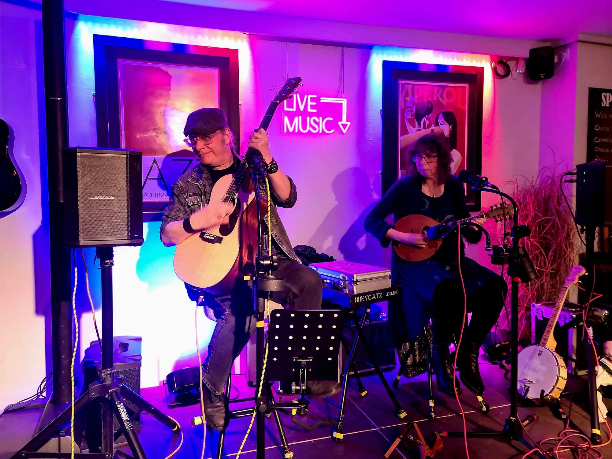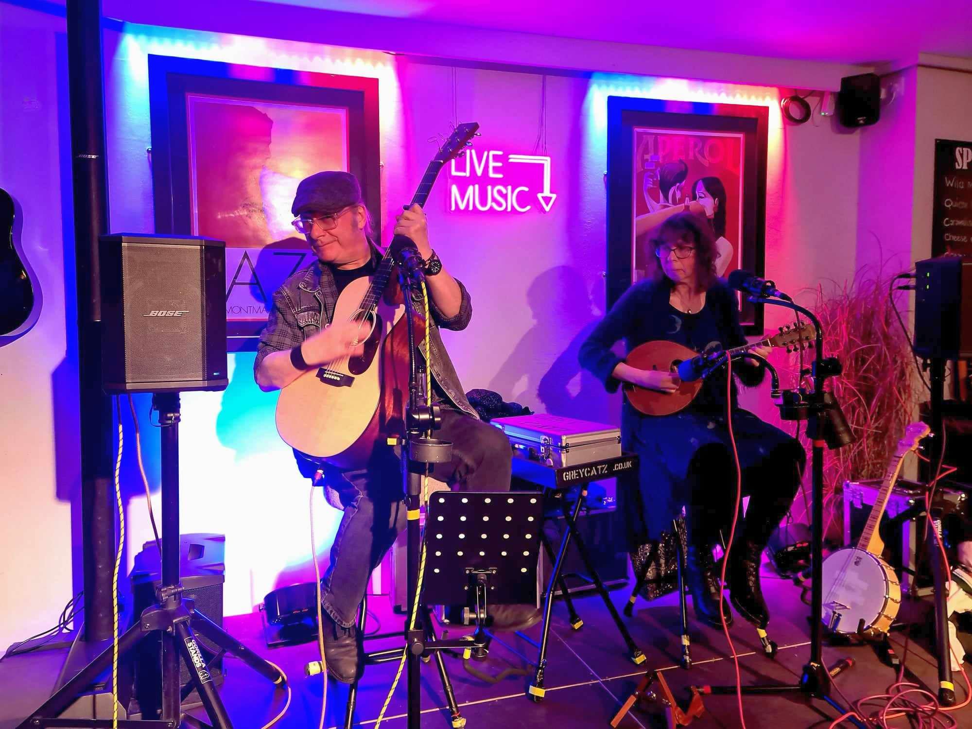 Bored with covers? We might be the answer then. See our videos for what we do. We play Guitar, Mandolin, Banjo and Harmonica during our live sets. No backing tracks or Karaoke. We do play some covers, but we can do much more than that. Helen is a session player, and I'm a guitar maker/ guitar teacher. Irish tunes and our own songs are what we excel at. So expect some dancing. Short notice gigs a specialty. Working together since 1988. Find us on Youtube - GREYCATZ.